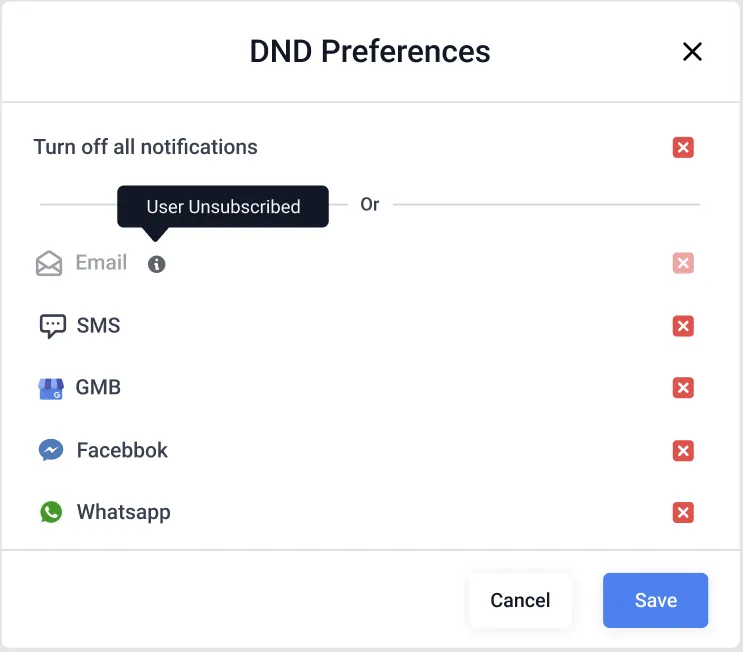 Permanent DND: The DND set at the contact level cannot be revoked by the agency or the location as the contact is incapable to receive the message or had opted out from receiving messages.