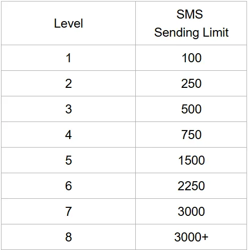 1. All Accounts start at Level 1, enabling them to send 100 SMS within 24 hours.