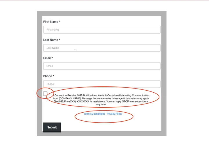 You need to specifically put a disclaimer like - "By submitting this form, you consent to receive marketing and promotional SMS messages from [Your Company Name]. Message frequency may vary. Reply "STOP" to unsubscribe. Text HELP for assistance. Standard message and data rates may apply. Your information will be handled in accordance with our Privacy Policy."