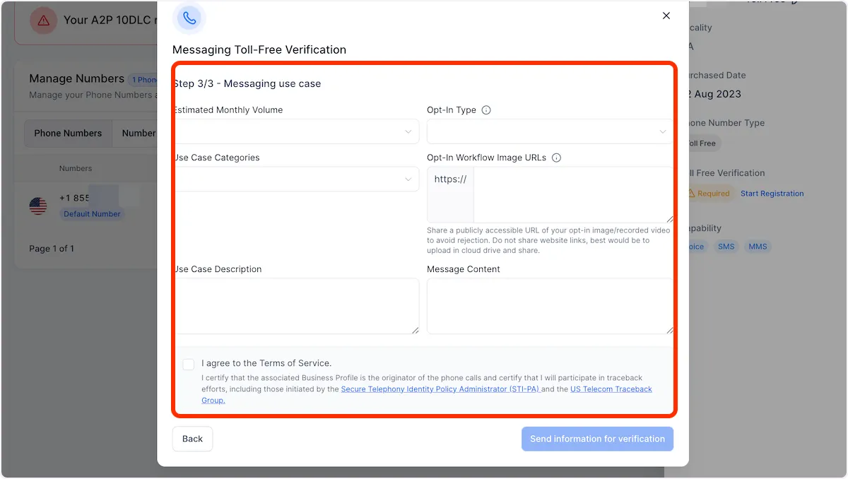 Select the use case that you believe best fits your customer’s traffic pattern. This should be the use case that best fits the types of messages being sent by this toll-free phone number.