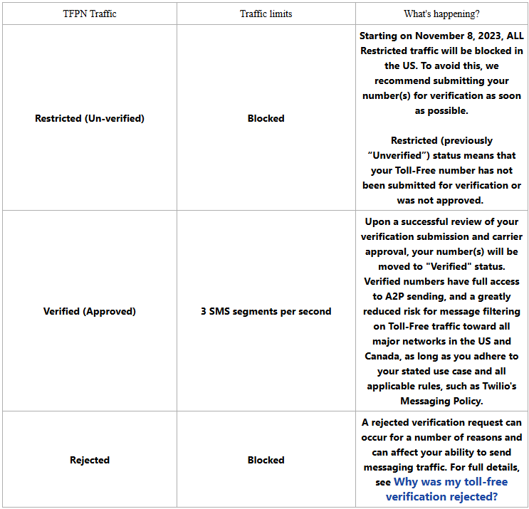 Starting on November 8, 2023, all unverified (Restricted) Toll-Free numbers will be blocked from sending messages to the US. Restricted Toll-free messaging traffic to Canada continues to remain blocked until verified.